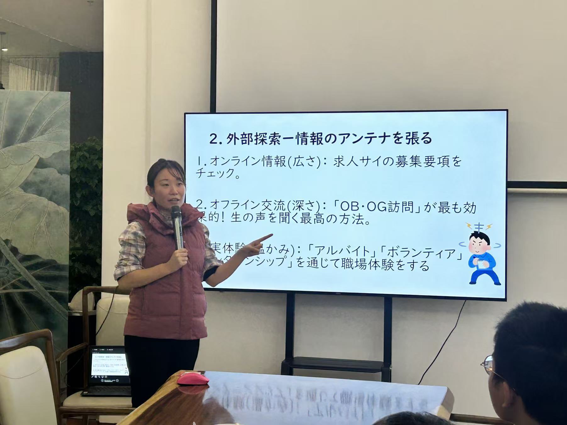 外教金崎藍子老师以“指南针”为巧妙喻体,用跨文化视角开启互动环节。她将职业选择比作 “人生导航”,引导同学们将 “指南针指针” 与自身特质精准对齐:从 “我具备哪些核心能力” 到 “我真正热爱什么领域”,再到 “我的兴趣如何转化为职业优势”,层层递进的引导让同学们逐步看清自我定位。在轻松融洽的问答氛围中,不少同学主动举手分享困惑,金崎藍子老师逐一耐心解答,帮助同学们重新审视自我核心要素,既明确了未来探索的方向,更积蓄了 “按自己节奏规划人生” 的笃定底气。