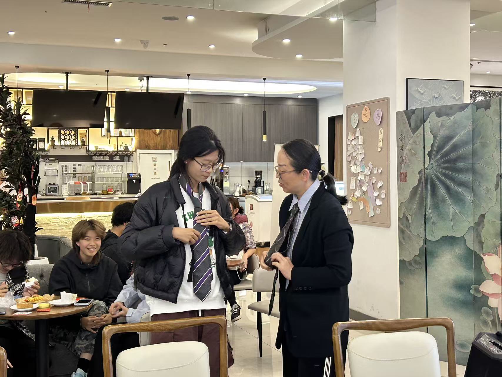 张冬老师则聚焦职场基础素养,设计了趣味十足的 “系领带” 互动环节。考虑到不少同学对职场礼仪的陌生感,她先示范标准步骤,再走到同学们中间手把手指导;从领带长度的把控到打结力度的调整,细致讲解每一个细节。同学们在亲手实践中笑声不断,原本生硬的职场礼仪变成了可触摸、可操作的技能;这场沉浸式体验不仅让大家掌握了实用技巧,更悄然拉近了与未来职业身份的距离,对职场新人的角色认知有了更直观的理解。