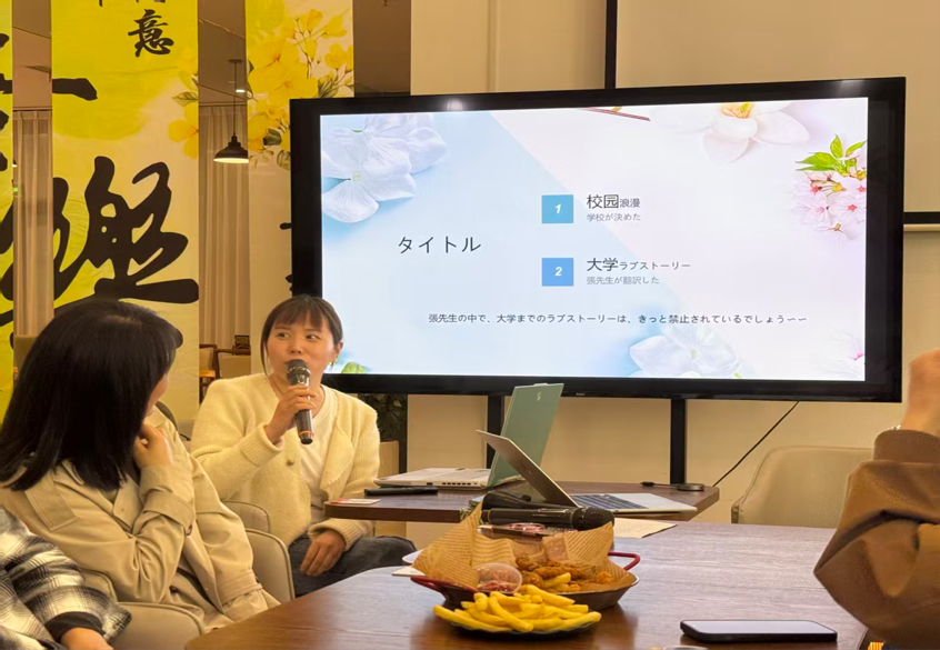 自由交流环节中,同学们围坐畅谈理想型恋人、分享心动记忆与未来情感设想,即便日语表达有时流畅有时断续,却都饱含真诚。有同学鼓起勇气用日语讲述自身经历,现场不时响起鼓励的掌声,让“校园恋爱”这一主题更显真实可感。